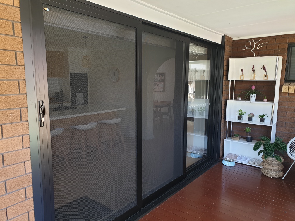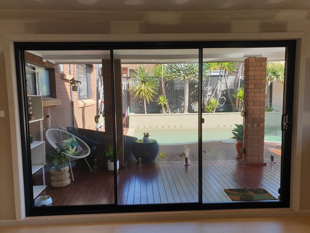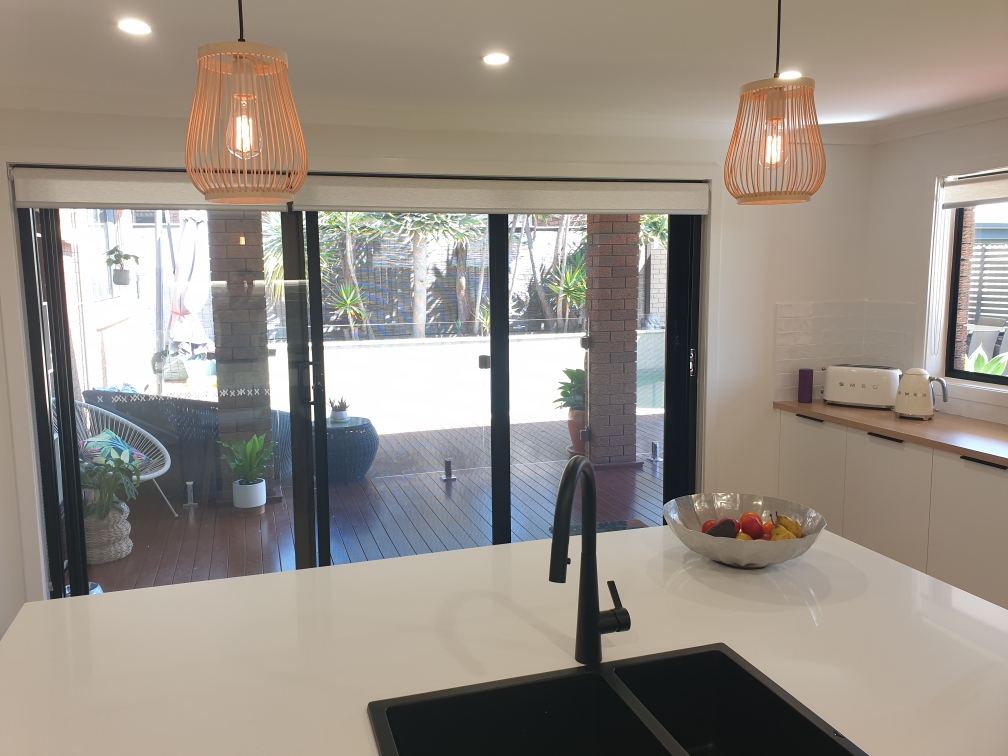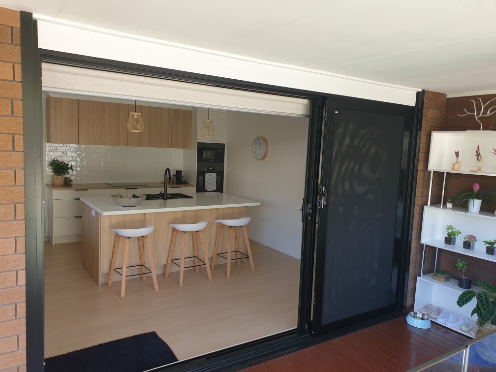 Our Barrack Heights clients were having their kitchen renovated by Kinsman Kitchens (often featured on The Block). To finish off their desired look they wanted a three-panel stacker door installed leading from the kitchen onto their existing deck. This required removing existing brickwork on the outside of the kitchen area, installing a new support head in the timber frame to support the weight of the new door and installing the new Hanlon’s door and Amplimesh security fly screen. Our clients also wanted the kitchen ceiling replaced. Both of these jobs were not services provided by the kitchen company so we came on board to assist.