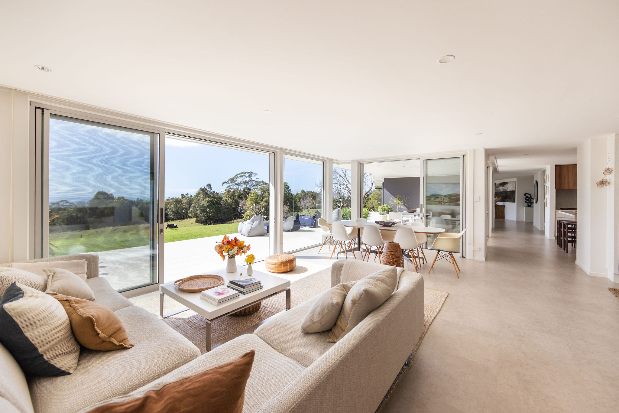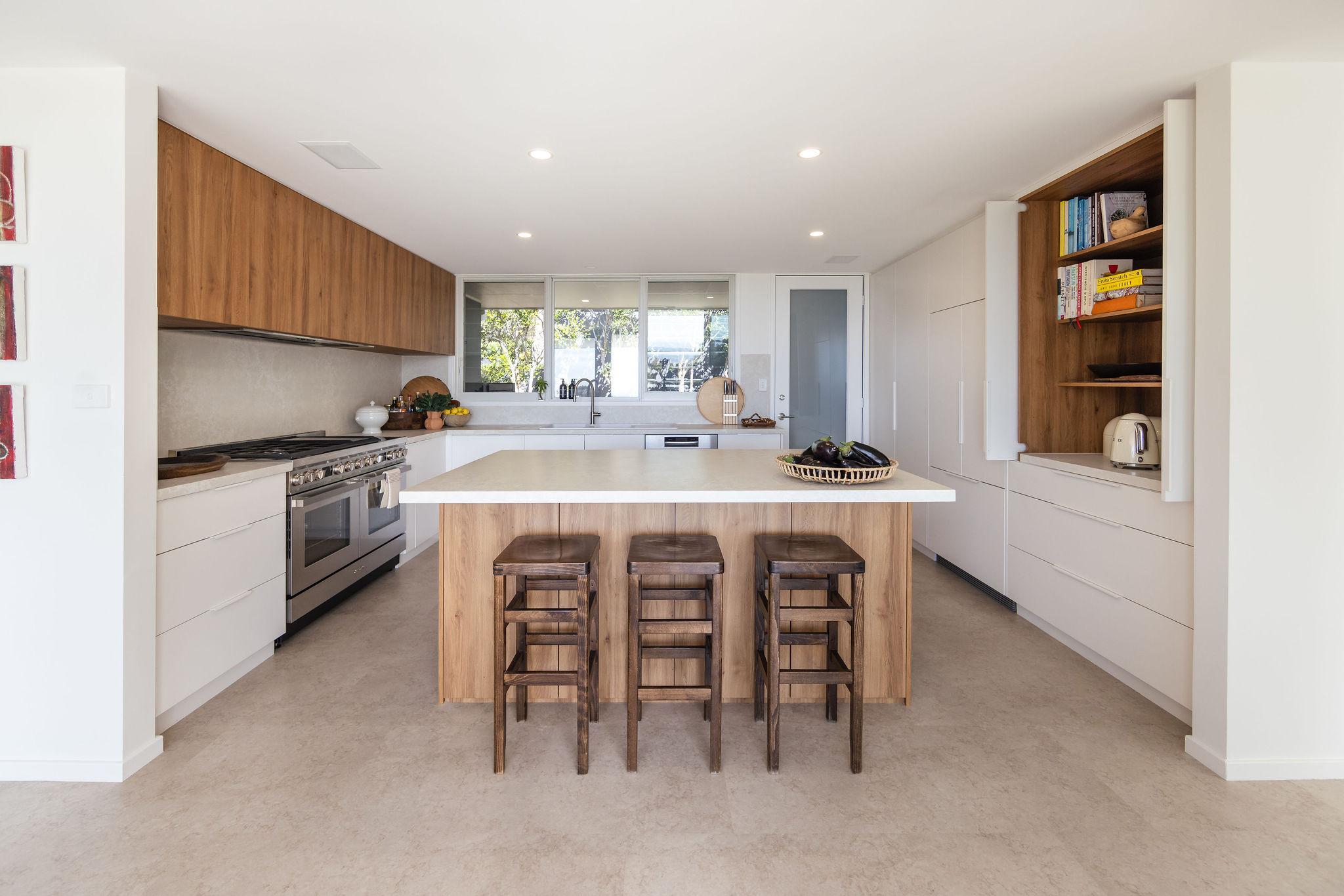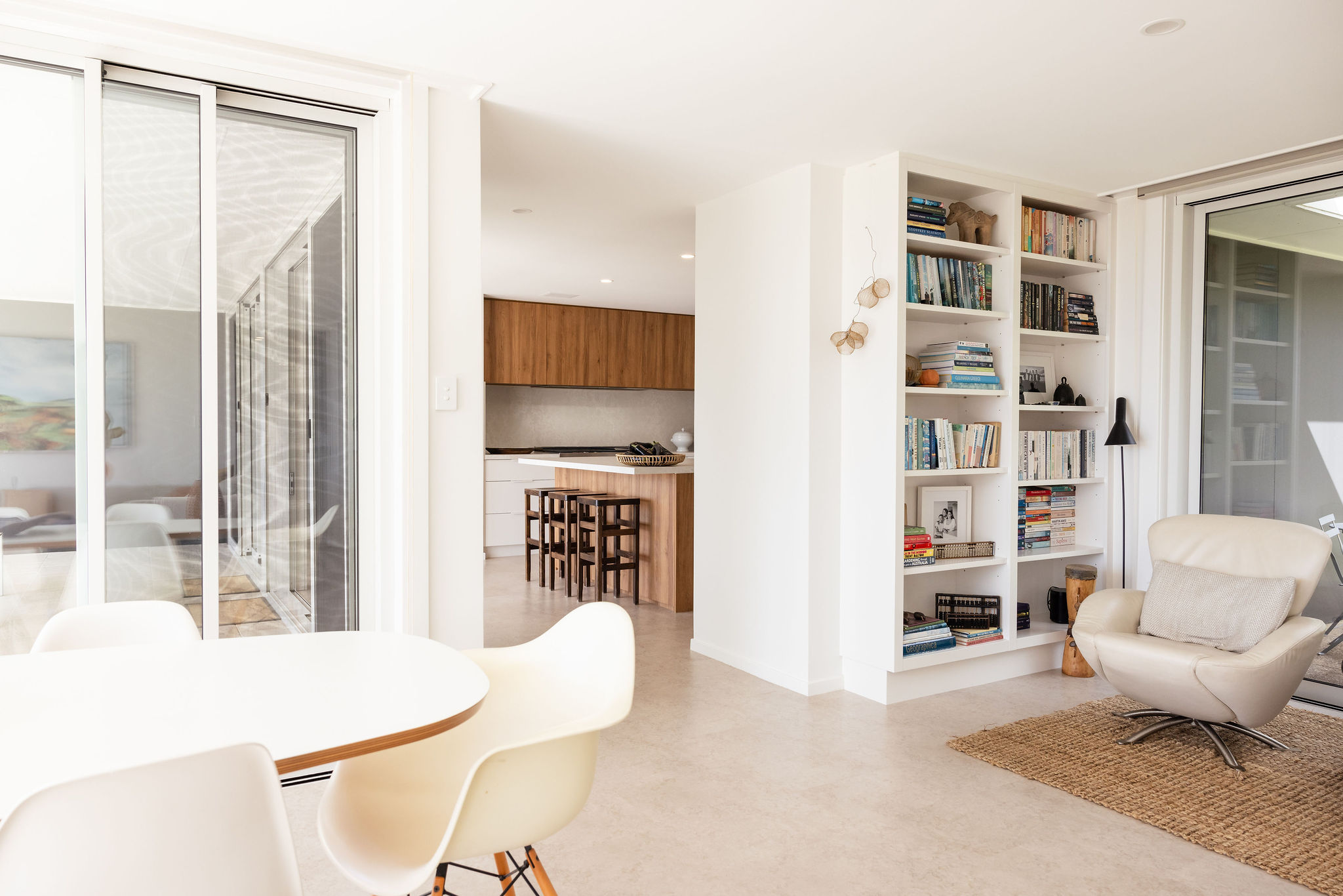 Originally built in the mid 1980s as a small three-bedroom brick home, this house was later extended, creating more living spaces, bedrooms and wet rooms. The design is reminiscent of a California Ranch Style house, characterised by its low roofline, gentle L-shaped layout, open living spaces and large windows and sliding doors that seamlessly connect the interior to the exterior.